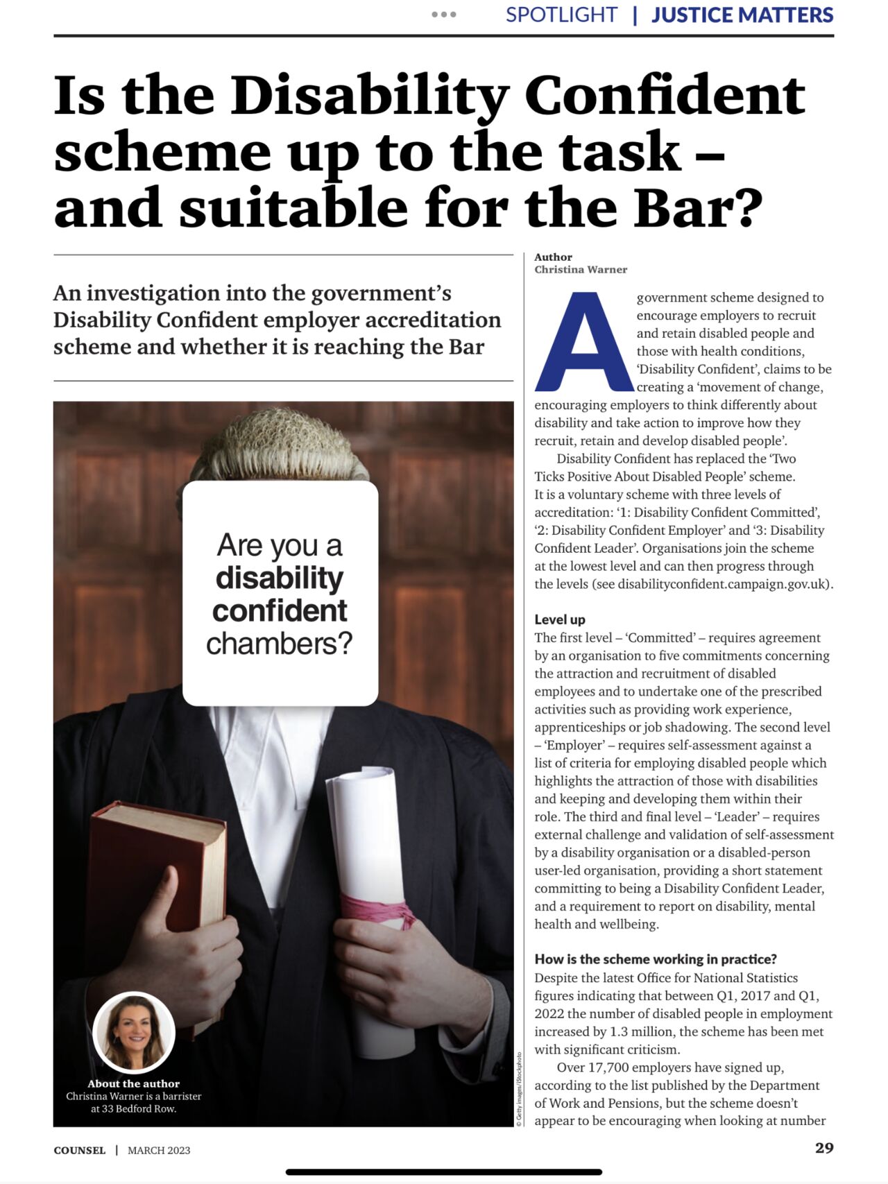 33 Bedford Row's Christina Warner has been featured in this month's edition of Counsel Magazine. Christina looks at the Disability Confident scheme and whether it's appropriate of sufficient for the Bar.
