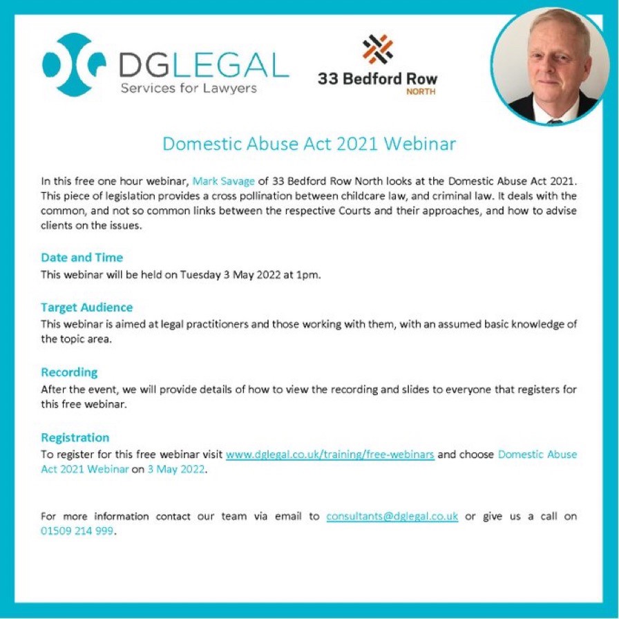 Share Mark Savage of 33 Bedford Row North will be leading a free one-hour seminar, examining the Domestic Abuse Act 2021. The event will take place 3rd May 2022 at 1pm. Register for the event here.