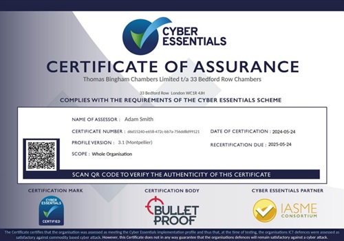 The Certificate certifies that 33 Bedford Row has been assessed and meets the Cyber Essentials implementation profile and that our ICT defences were assessed as satisfactory against commodity based cyber attack.