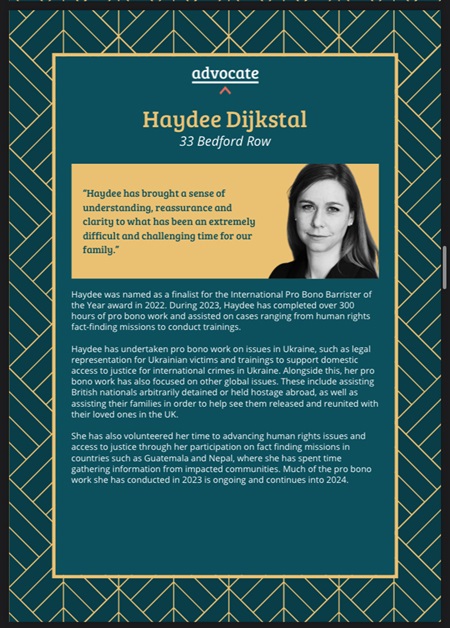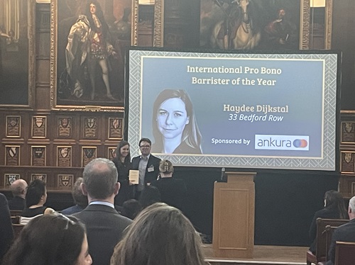 Chambers is delighted to announce that at last night's Advocate's Awards Ceremony, Haydee Dijkstal - Barrister and Head of International Law at 33 Bedford Row - won the International Pro Bono Barrister of the Year Award.